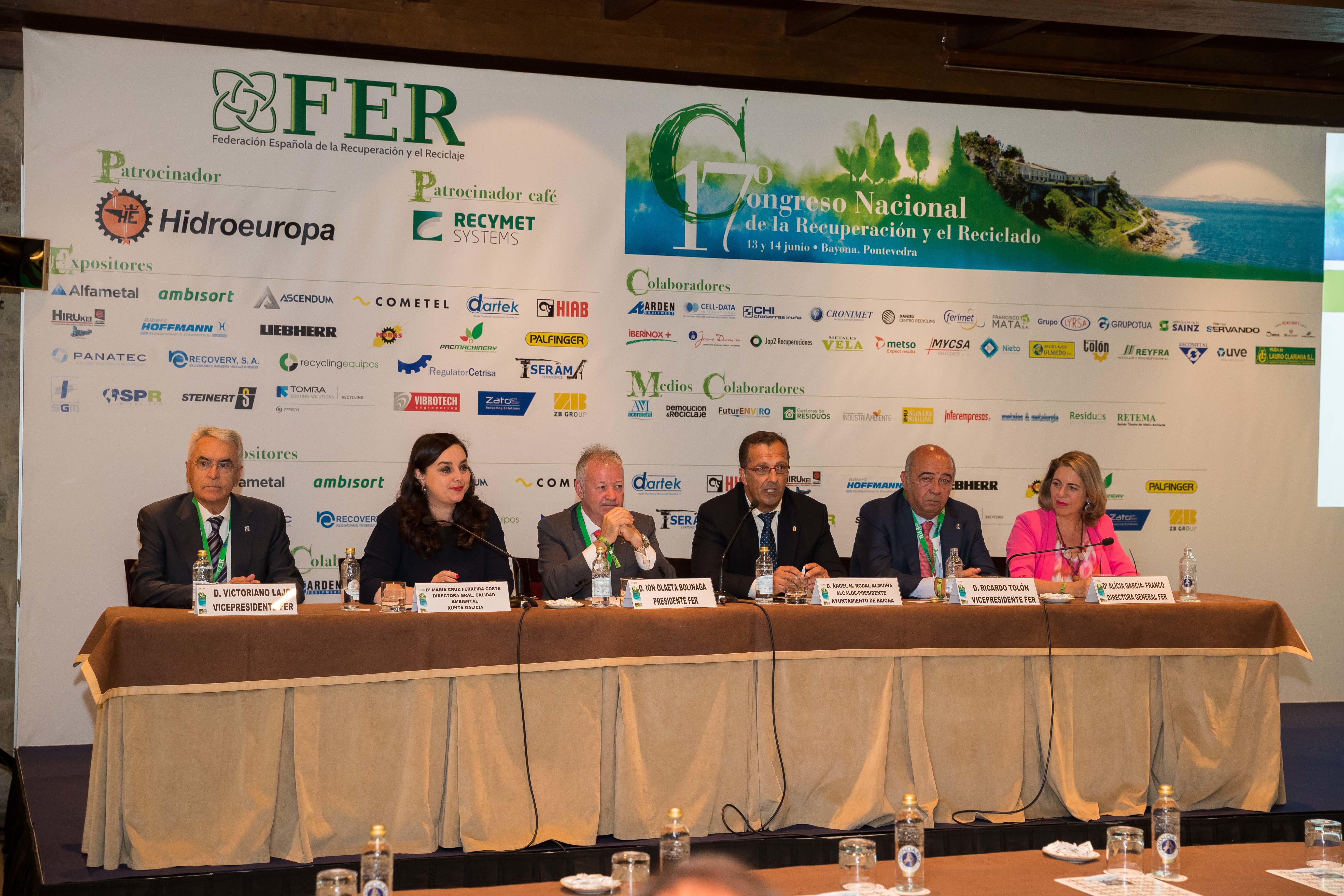 La Federación Española de la Recuperación y el Reciclaje (FER) celebró en la mañana de ayer la primera jornada de su 17º Congreso. Al acto inaugural, además del presidente de la Federación, Ion Olaeta, acudió Ángel Rodal, Alcalde del Ayuntamiento de Baiona, y María Cruz Ferreira, directora general de Calidad Ambiental y Cambio Climático de la Xunta de Galicia.