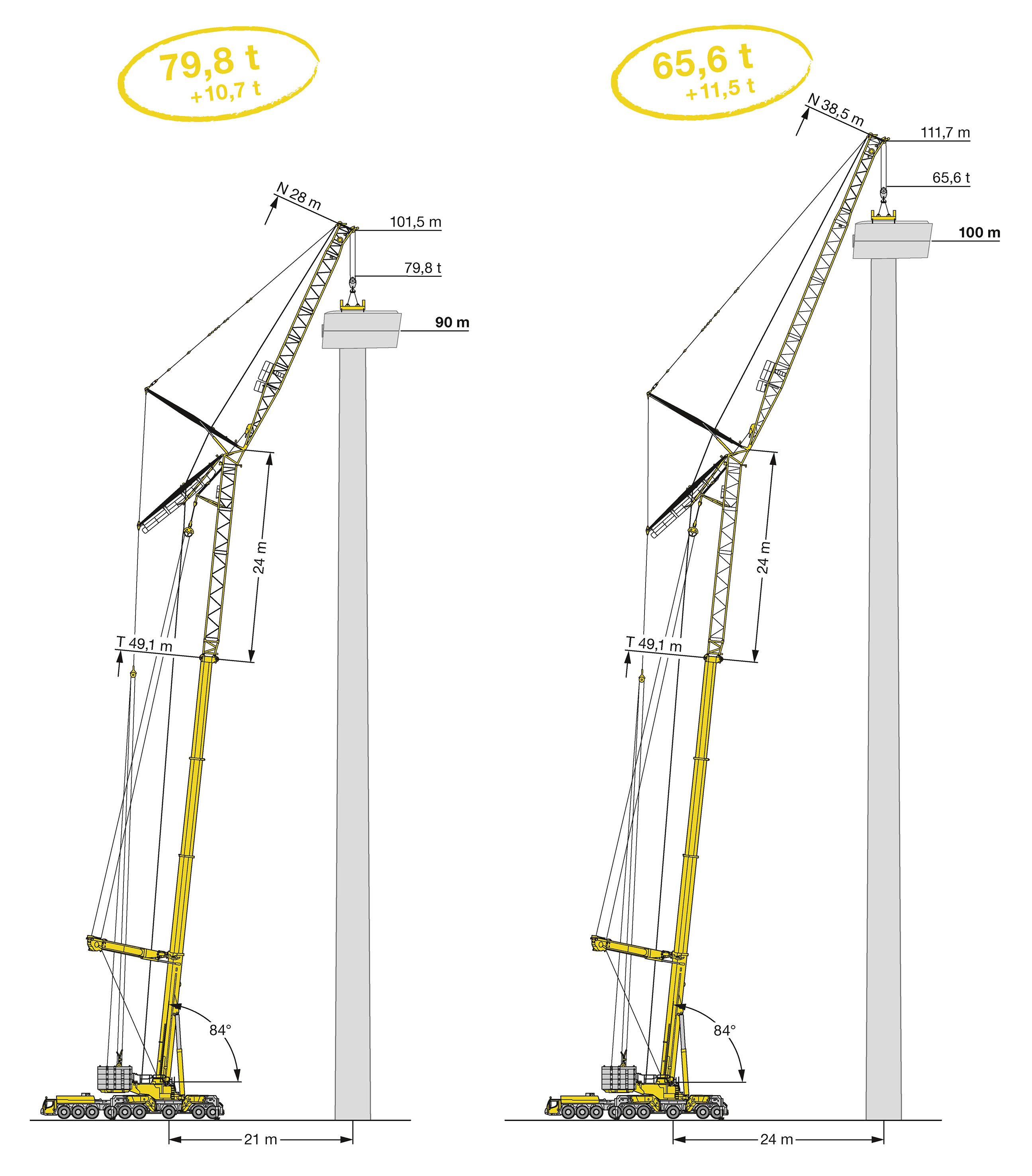 Liebherr ha creado una nueva configuración de pluma con plumín abatible, utilizando secciones de celosía existentes para proporcionar un aumento de capacidad extra, para trabajos eólicos. Las grúas que ya están disponibles en el mercado, se pueden actualizar con el nuevo sistema.