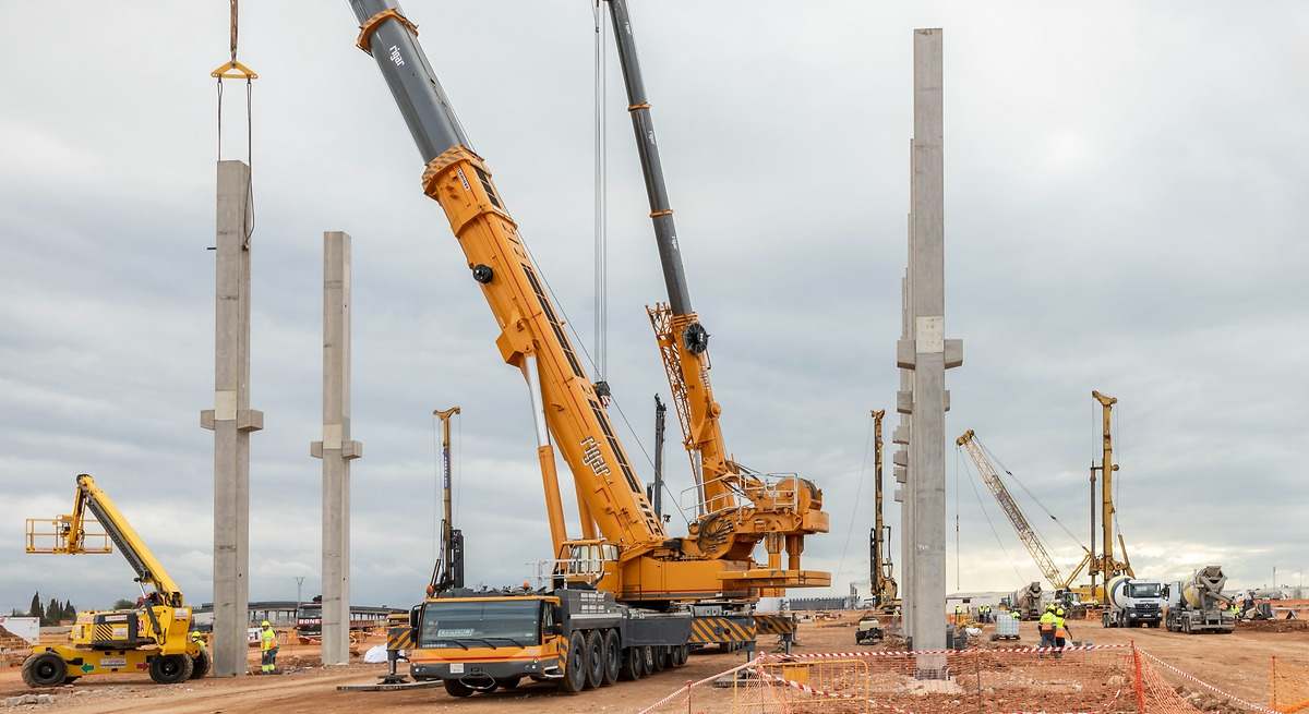 La construcción de la gigafactoría está planificada de manera secuencial, lo que permite solapar distintas fases de obra a la vez. Por ello, mientras se avanza con las cimentaciones profundas, los equipos de construcción introducen también los pilares de hormigón.