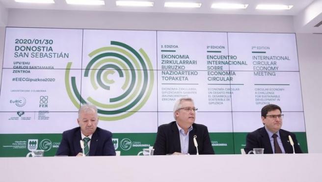 El diputado de Medio Ambiente, José Ignacio Asensio, el presidente de la Federación Española del reciclaje (FER), Ion Olaeta, y Xabier Ostolaza, director de la Escuela de Ingeniería de la Universidad del País Vasco, han presentado en rueda de prensa los detalles del encuentro.