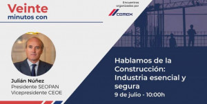 “La construcción de infraestructuras constituye la principal palanca para reactivar el país. Para recuperar la economía hace falta inversión pública”. Con esta contundente afirmación, Julián Núñez, presidente de la Asociación de Empresas Constructoras y Concesionarias de infraestructuras (Seopan) y vicepresidente de la Confederación Española de Organizaciones Empresariales (CEOE), comenzó su intervención este jueves, 9 de julio, como primer invitado de los Webfast Cemex: ‘Veinte minutos con’. Núñez desgranó una a una las claves del papel de la construcción en la reactivación económica del país, destacando: el impacto en el PIB, la creación de empleo, el desarrollo social y el cumplimiento de la agenda 2030como las cuatro palancas principales.